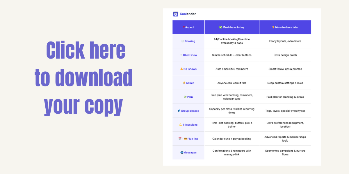 | With Koalendar | You create: One booking page for group classes with capacity limits One page for 1:1 sessions with buffers Payments at booking for both | Create separate booking pages for each class type or instructor. Set maximum class sizes and rules for cancellations. Sync all instructor calendars so they see bookings next to their other commitments | Keep your existing membership tool. Use Koalendar only for PT and special classes. Give each trainer a personal booking link |