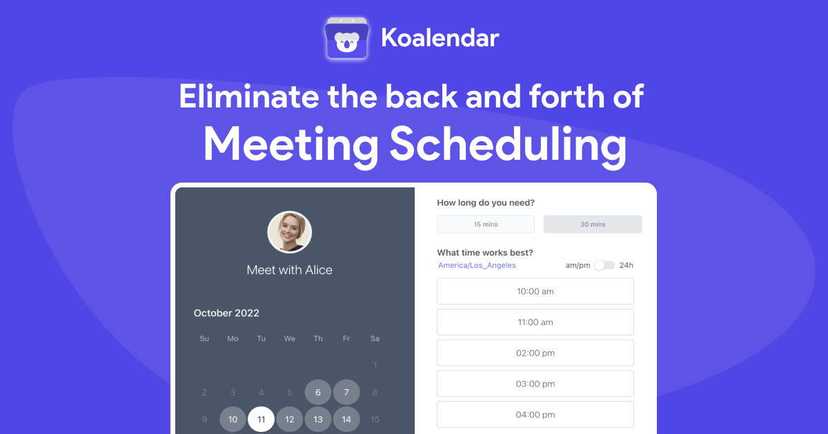 “Koalendar has made scheduling meetings and calls so much easier. I no longer have to send over an email with all of the dates/times I am free. I just simply send a link and they can see the times I have open. I love it!”